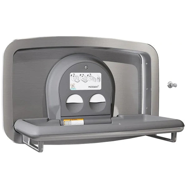 Its fold-down bed provides a stable changing surface supported by internal steel reinforcements, while the antimicrobial surface helps reduce odor and bacterial growth between cleanings. Dual liner dispensers allow for quick restocking, and a stainless steel bag hook keeps personal items close at hand. Designed for heavy daily use, the KB310-SSRE supports up to 50 lbs and meets ADA and ASTM safety standards when properly installed.